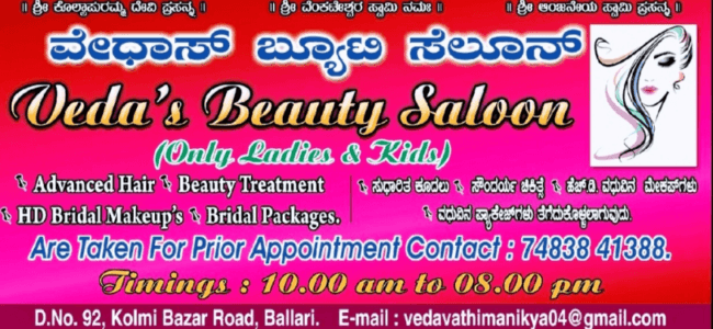 “Veda’s beauty saloon will provide you all services at best prices in and arround Bellary district.. We follow all covid precautions.. Please visit and enjoy your time.